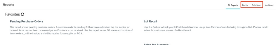 Published reports can be accessed from the top right of the reports screen in the Published tab. Reports that have been saved but not published will appear in the Draft tab.