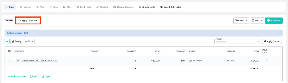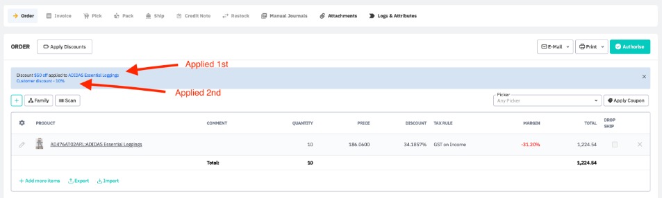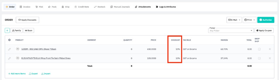 Discounts in Cin7 Core are either displayed as reductions in sale prices or as a discount total percentage (%), according to your discount settings (described above). Your settings are reflected in your generated sales documents.