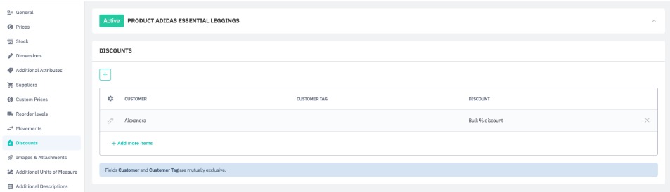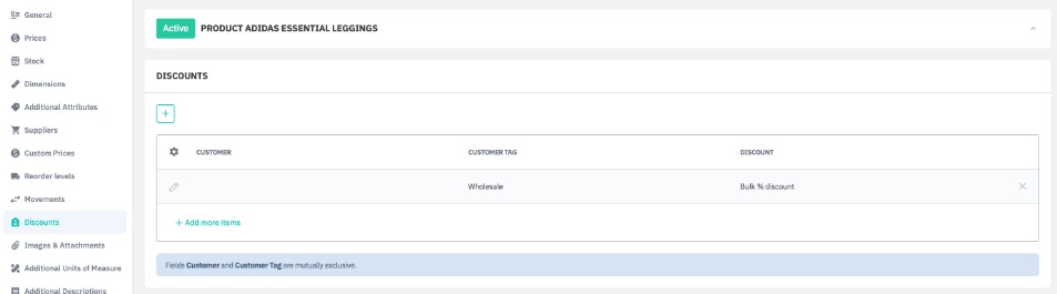 Discounts applied at this level can be applied to just this product, on any sale order and for any customer. To add discounts to all products within a category, brand, or with a specific product tag, use Product Deals.