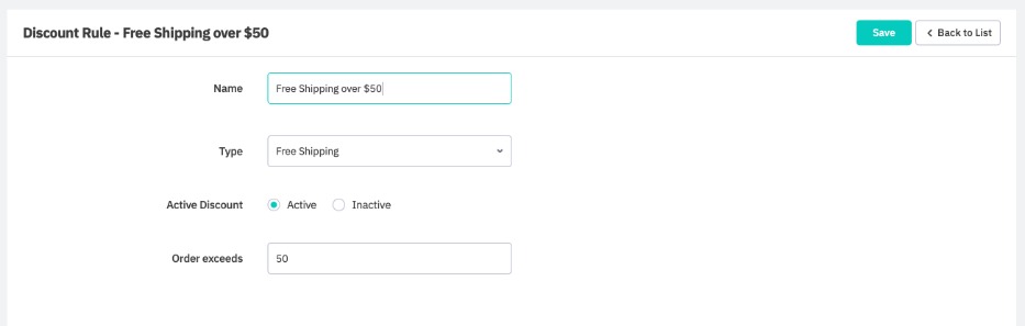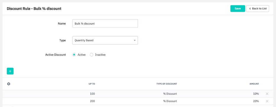 Click Save. If you click Back to List, you will see the new discount rule appear in the list on the Discounts page.