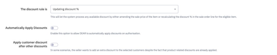 There are three options for displaying discounts: Updating the sale price and Updating discount %. Updating the sale price will cause discounts to automatically reduce the unit cost and sale price. Updating discount % will display the total percentage discount of the order line. Sale documents will also reflect this setting.