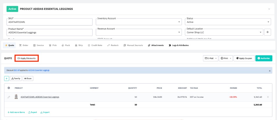 If the Automatically Apply Discounts setting is set to Yes, the product discount will be added automatically when the sale quote or sale order is authorized. It is also possible to manually apply the discount by clicking Apply Discounts. If the Automatically Apply Discounts setting is set to No, the user must click Apply Discounts for the product discount to be applied. A note showing the discount applied will be listed at the top of the quote/order screen.