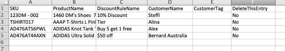 Each discount for a product must be added in a new line. SKU and DiscountRuleName are required, ProductName is included on export for your information only. CustomerName and CustomerTag are mutually exclusive. One of these fields is required for each product line, but entering information into both will cause an error.