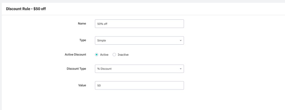 Enter a Value for the discount. This value depends on the discount type, e.g. if Discount Type is set to Discount Amount, entering 10 in the Value box means that $10 will be discounted from the price of products to which the rule is applied. If Discount Type is set to %Discount, a 10% discount will be applied instead.