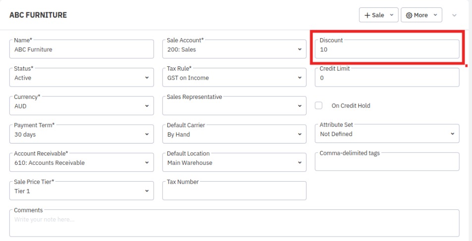 If the Automatically Apply Discounts setting is set to Yes, the customer discount will be added automatically to sale quote or sale order lines in the Discount field.