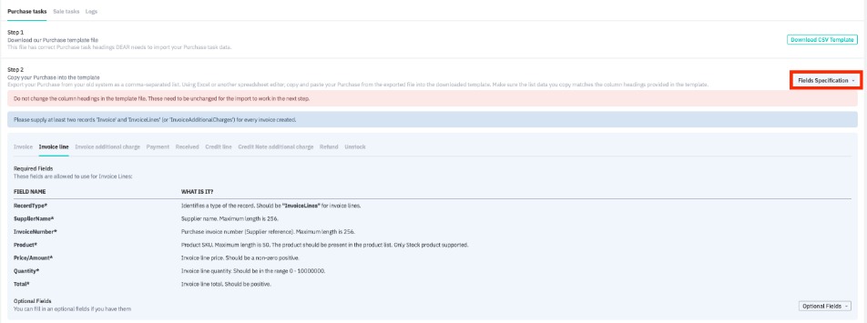 Select the Purchase tasks tab and download the CSV template. Cin7 Core allows you to import a lot of purchase information, including (if applicable) stock received lines, payments, credit notes, refunds, and unstock information.