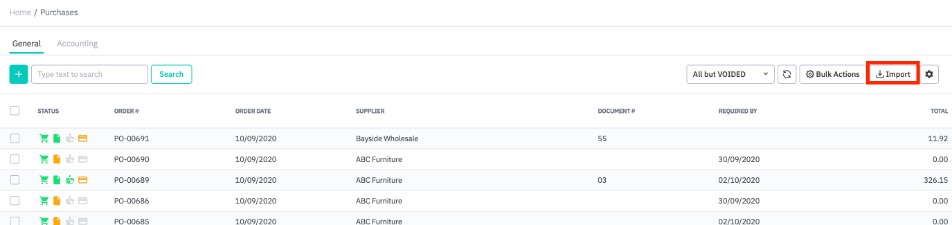 Import your purchase tasks from the Purchases → Purchases screen, then clicking Import. You can: