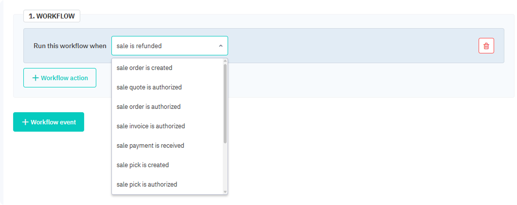 Under 1. Workflow, select the event you want to trigger your workflow.