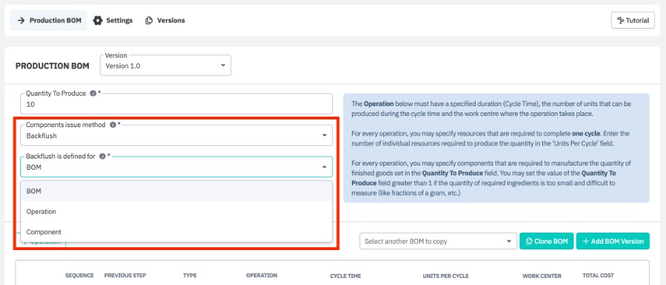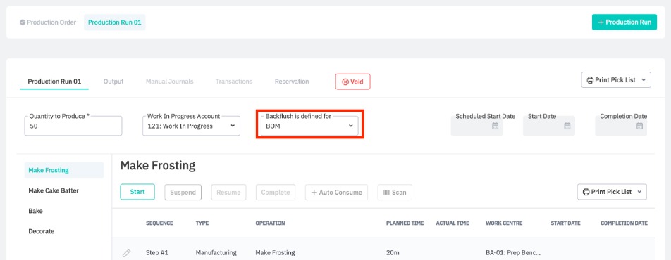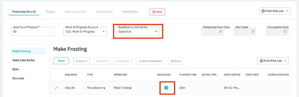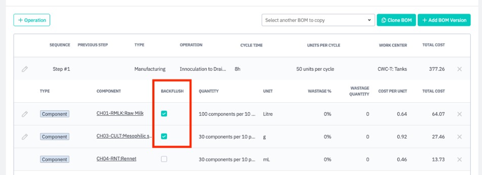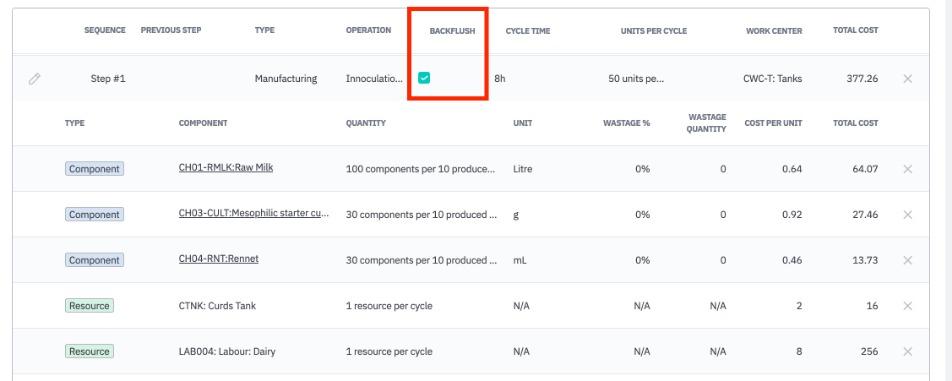 When backflush is applied to operation, each operation will have a checkbox to enable/disable backflush for the operation. This cannot be edited after production starts.