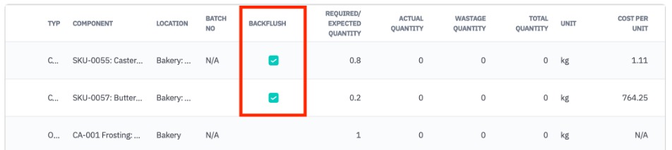 When backflush is applied to components, each component will have a checkbox to enable/disable backflush for the component. This cannot be edited after production starts.