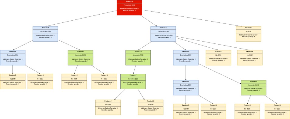 The low level elements are highlighted with yellow. These are simple components which need to be bought or transferred from another location to complete product A. This can be carried out automatically or manually depending on your production process settings, and quantity available in your shop floor and connected warehouse.