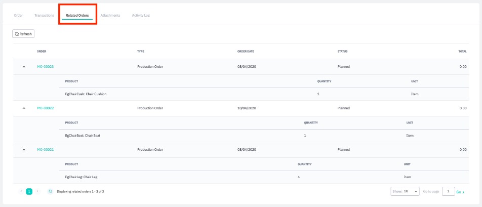 Related orders tab will show nested production orders for semi-finished components and for the next nested level up.