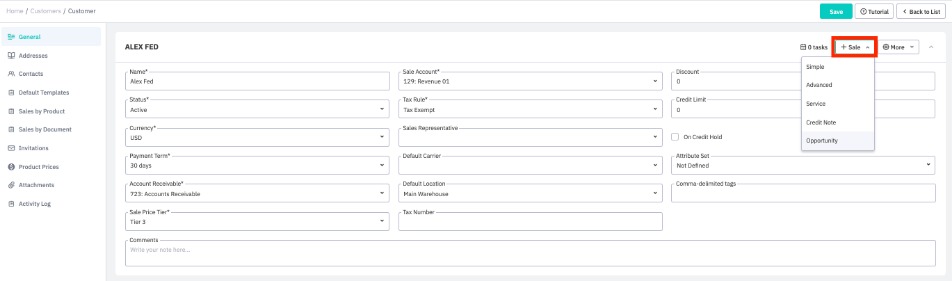 Opportunity fields marked with an asterisk (*) are mandatory. This information will be inherited by the sale quote if opportunity is later converted to a sale quote. Enter the opportunity details into the document header and Save your changes to add the opportunity.