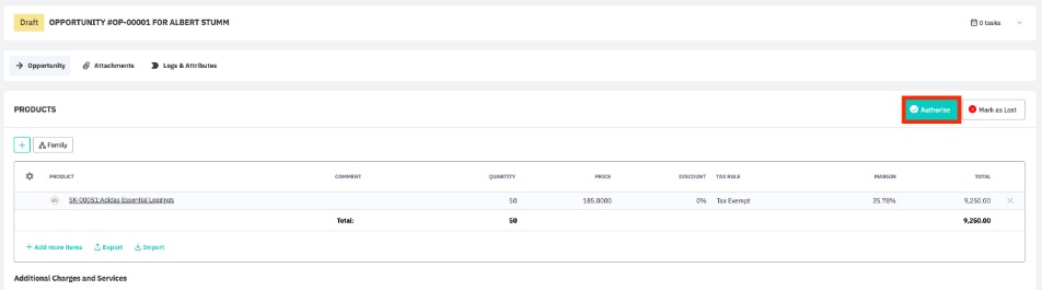 Note: If opportunity approval is enabled, clicking Authorize changes the opportunity status to Awaiting Approval. An authorized user must then Approve or Reject the opportunity. Only users with the Cin7 Core CRM → Task Approval user permission are able to approve opportunities.