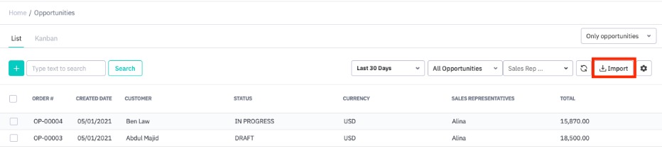 Import large numbers of opportunities via CSV file to save time. Opportunities are imported from the opportunities dashboard (CRM → Opportunities).