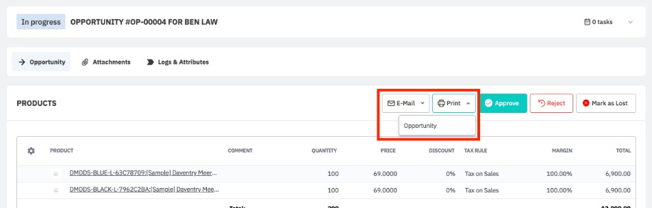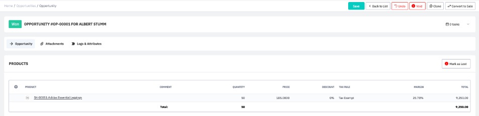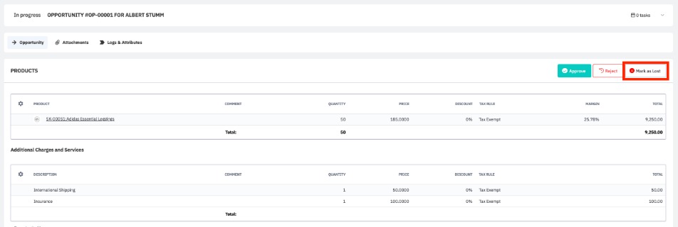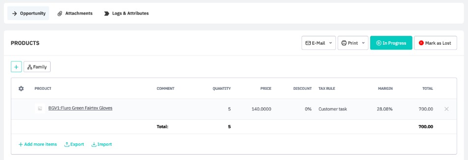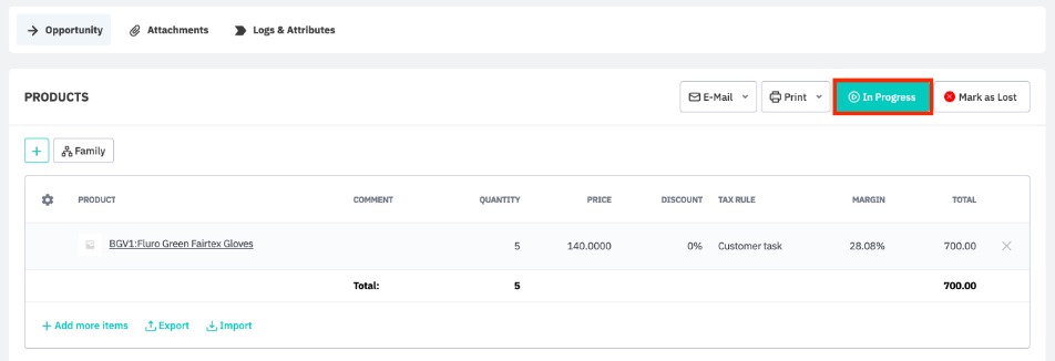 Once you have finished adding products and services to your opportunity and saved your changes, you may click In Progress to mark the opportunity as in progress, e.g. to mark when a sales representative starts working on an opportunity.