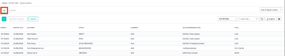 View your opportunities in list format from the List view. List view can be filtered by date range, opportunity status and sales rep using the filters in the toolbar, as well as import opportunities. You can choose to show sales only, opportunities only, or sales and opportunities on this view.