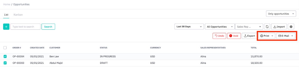 You can also perform print or email multiple opportunities at once by going to the opportunities dashboard (CRM → Opportunities), selecting the checkbox next to one or more opportunities to make the actions toolbar visible.