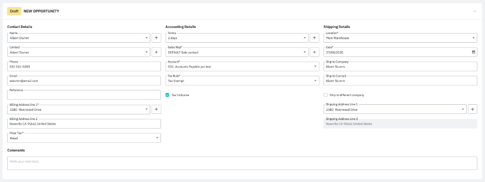 Shipping Address: Shipping contact. Autofilled from the customer or lead details. Check Ship to different company to enter another value.