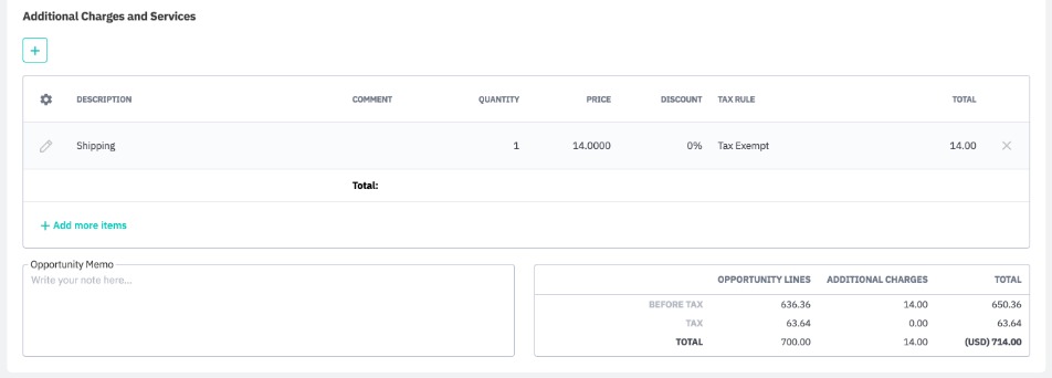 The lower field is for additional charges – any non-inventory or service items (e.g. shipping, handling), which need to be added to the opportunity.