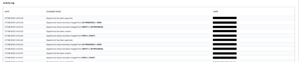 Section 2 covers activity logs. All user activities from the creation of the new sale opportunity onwards are logged.