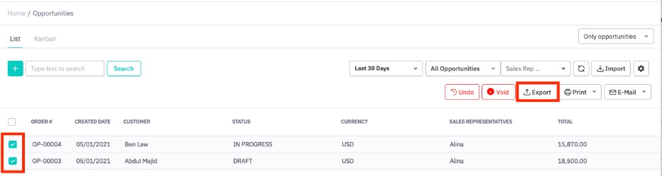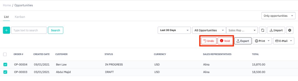 You can also undo or void multiple opportunities at once by going to the opportunities dashboard (CRM → Opportunities), selecting the checkbox next to one or more opportunities to make the actions toolbar visible. Next, simply click Undo or Void.
