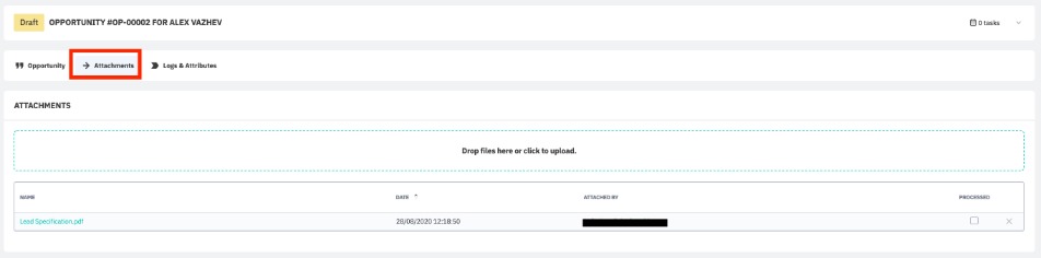 Documents can be attached to the sale opportunity in the Attachments tab. All printed and emailed documents will be saved here in PDF format automatically.