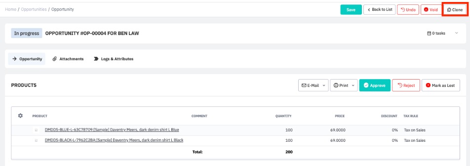 Opportunities can be cloned from the top-right of an opportunity's detail screen. Clone will recreate a new sale opportunity with the same details including lead/customer, products and services.