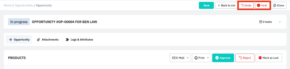 Undo or void an opportunity from the top-right of an opportunity's detail screen.