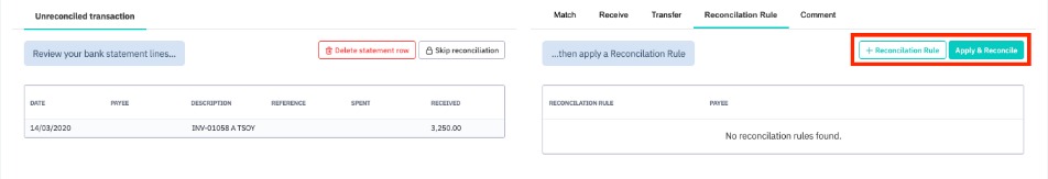 Note: Rules can be created during reconciliation. Use the Reconciliation Rule tab and click New Rule to add a new rule.