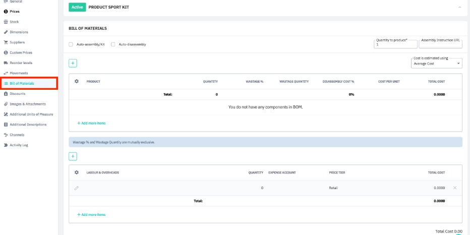 If Wastage %, Wastage quantity and/or Disassembly cost % are left blank when adding an Assembly BOM, Cin7 Core splits the cost of the components equally between product lines.