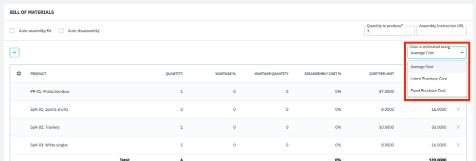 The Average cost, Latest purchase cost or Fixed purchase cost of the BOM components is used to estimate the cost of the finished costs.