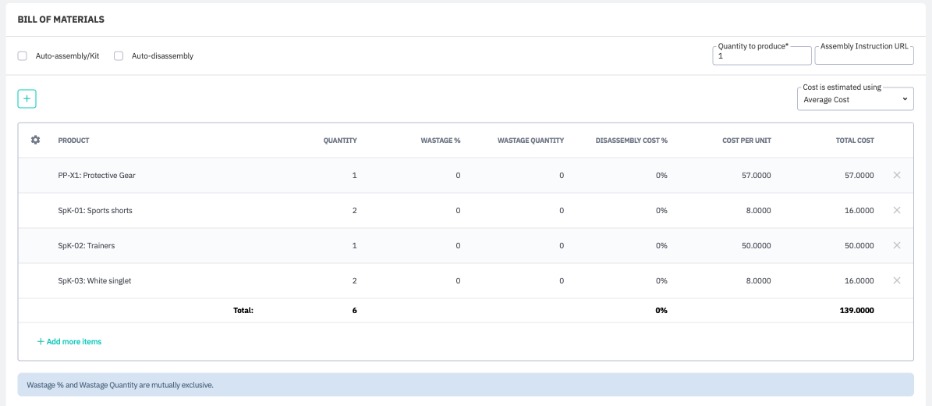 Wastage % and Wastage quantity are optional and mutually exclusive. If some of the components are wasted during assembly, use these fields to include that information.