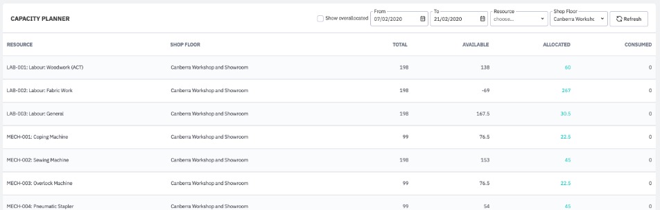Show overallocated – when Allocated capacity exceeds Available capacity, the resource is overallocated. This means that there is not enough capacity of the resource to complete all Production Orders in time. Overallocated resources have a negative number in the Available column.