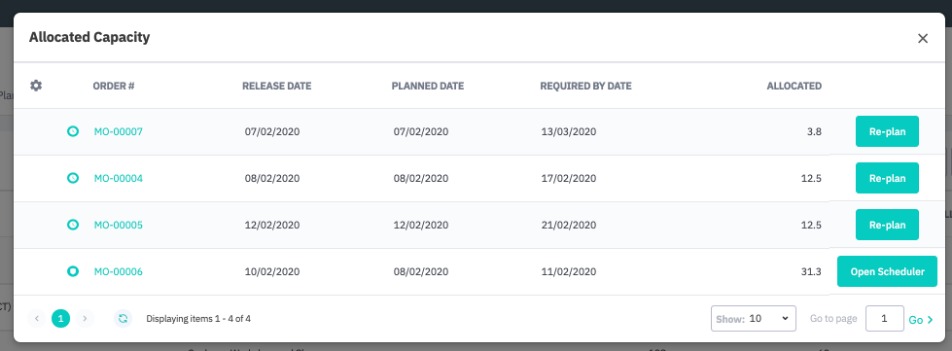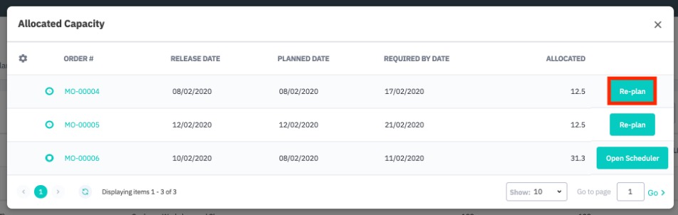 When the Re-plan button is pressed, the resources are reallocated automatically. The system will look for available capacity starting from the Required by Date backward to the current date.