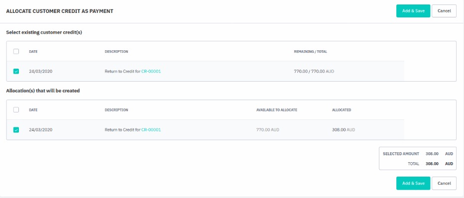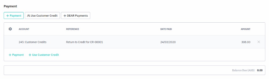 Click Add & Save. The customer credit is then added to the payments section and discounted from the total balance due. If the customer credit is more than enough to pay for the order, the total balance due will reflect zero, as seen in the screenshot below.