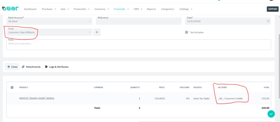 Select the product, enter the quantity and price, select a tax rule, and change the account to Customer Credits. The Quantity and Price should equal the amount deposited by the customer.