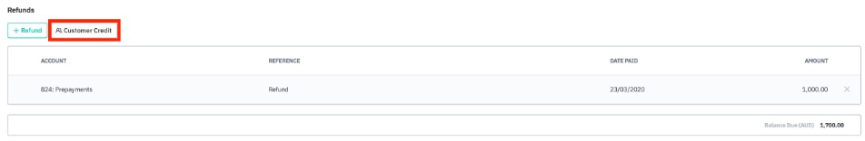 Scroll down to the Refunds section. Click Customer Credit to add the credit note value to the customer's account. When you make a sale to this customer in the future, they will be able to use their customer credit as a payment method.