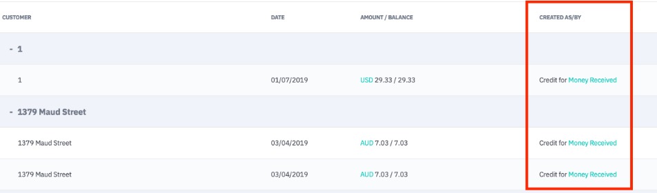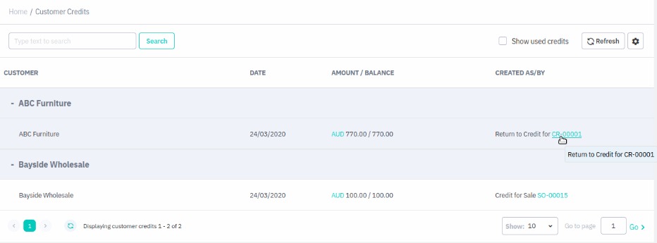The list of customer credits for each customer will be displayed. The transaction the credit is associated with can be accessed by clicking the link on the right.