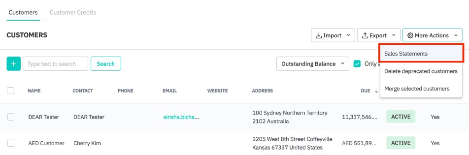 On the Customers page (Sales → Customers), click on the More Actions button and select Sales Statements from the dropdown. This will open the Sales Statements screen. If the customer list has been filtered, the filtered customers will be shown.