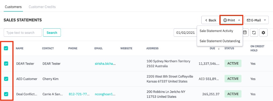 Select your Date range and select Customer/s by checking boxes next to the customer record. Click Print and select Sale Statement Activity or Sale Statement Outstanding from the dropdown menu. Alternatively, you can email them directly to the customer by clicking Email.
