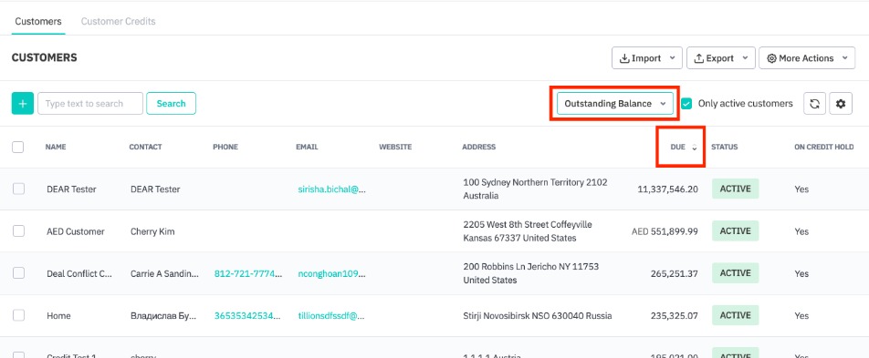 The customer list (Sales → Customers) can be filtered according to only show customers with an outstanding balance. Change the dropdown menu from All Customers to Outstanding Balance. Clicking the Due header can then sort customers according to highest outstanding balance.