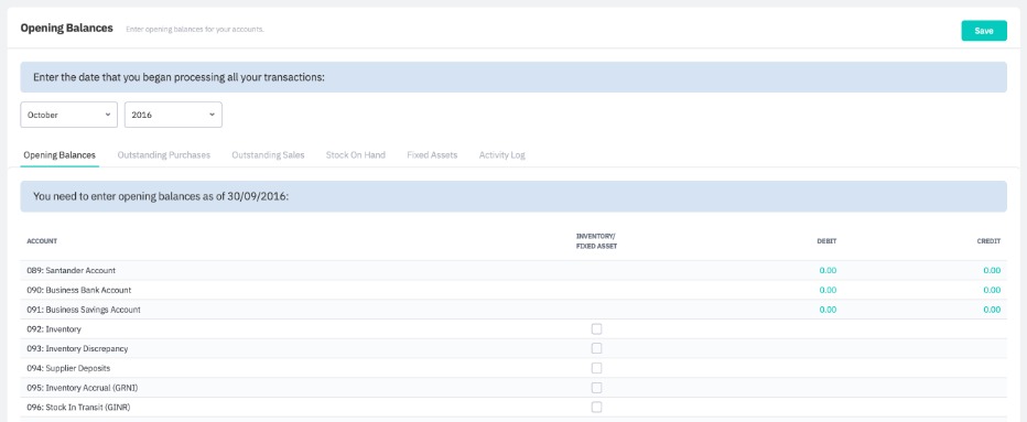 Start entering all balances from your existing accounting system as of the 30th September 2016 against the same accounts in Cin7 Core. Some accounts have special features to keep in mind - explained below.