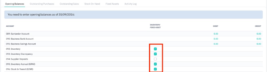 Some types of accounts have special features to keep in mind when entering opening balances. These are bank accounts, accounts receivable, accounts payable, inventory accounts, and fixed assets accounts. These will have to be reconciled with outstanding purchases, outstanding sales, stock on hand, and fixed assets.