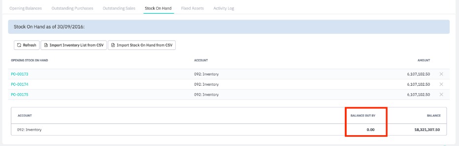 If the value entered on the Opening Balances tab for inventory accounts is equal to the value of the uploaded stock on hand, the balances will match. Ensure Balance Out By is 0 before starting to use Cin7 Core.