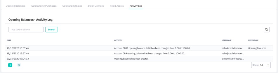 The Activity Log displays a lists of all actions taken in the Opening Balances section, with time/date stamps and user identification.