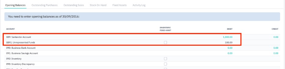 Example: The trial balance from the previous system shows a balance for $1,100 in the Santander Account, but the bank statement shows the balance for that account is $1,000. This is because there has been a transaction worth $100 which has not yet come through to the bank statement.