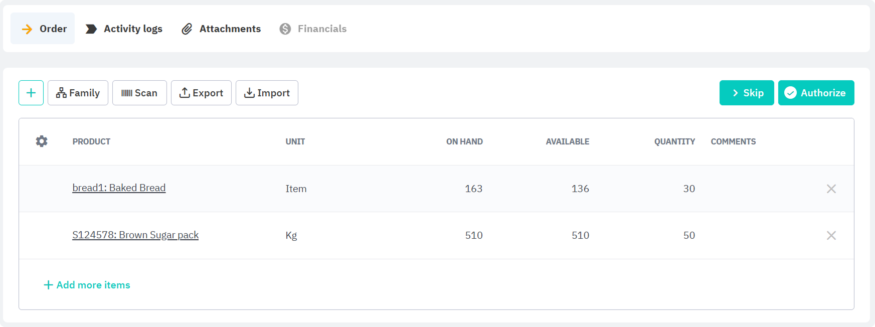 - On either the Order, Products, or Pick tabs, select Import.
