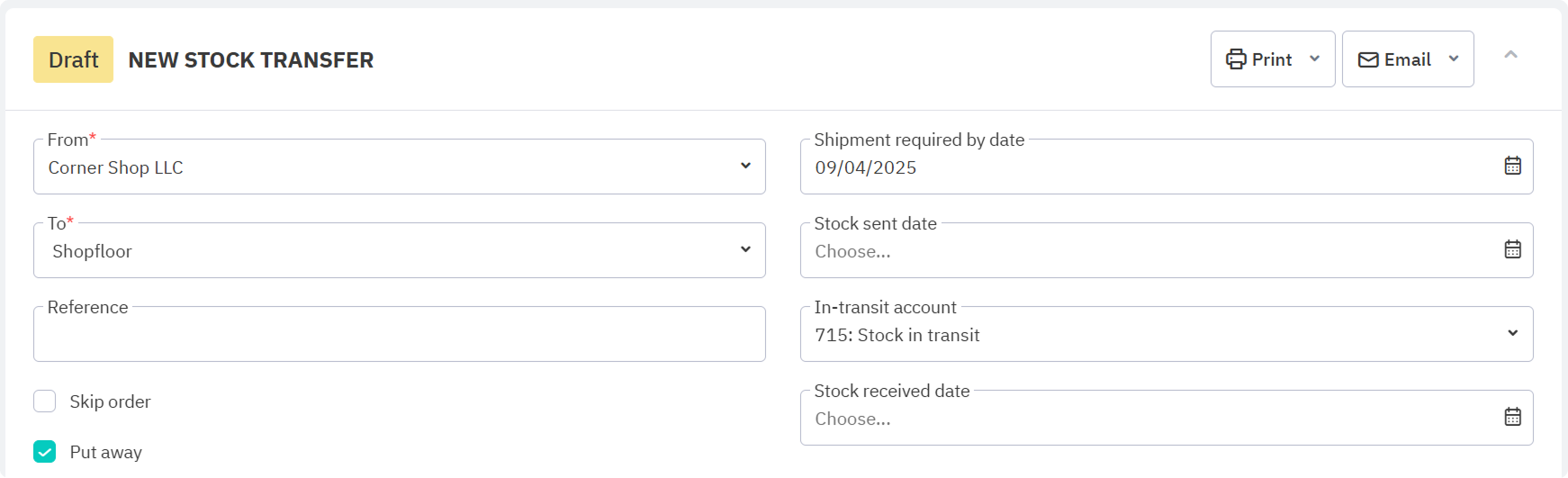 - Enter a Stock received date, then select Complete.This completes the stock transfer. If you have put away enabled, you need to put away received stock first.