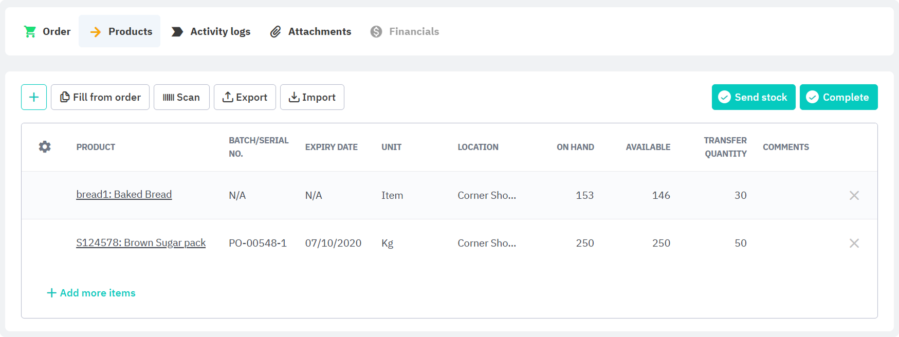 Import and export stock transfer products via CSV when creating an order or when picking products to transfer. Applicable to Draft and Ordered stock transfers only.